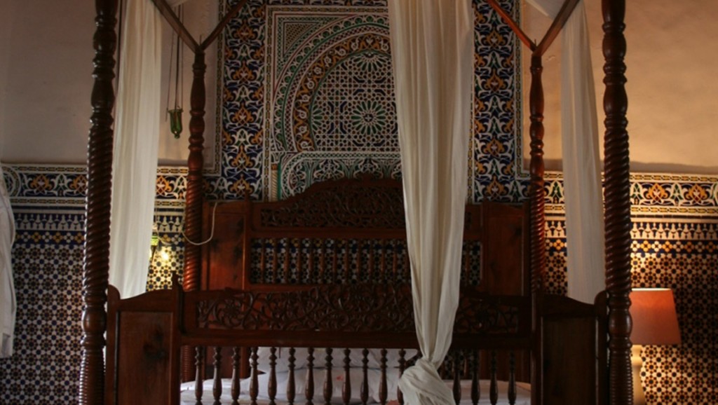 Elle est la plus grande et je la qualifie de « petite suite » aux airs des 1001 nuits. C’est la seule qui est décorée traditionnellement avec son zellij d’origine, son plafond en bois teinté, son sol en terre cuite. Elle est très lumineuse et ouverte sur le patio et la ruelle.