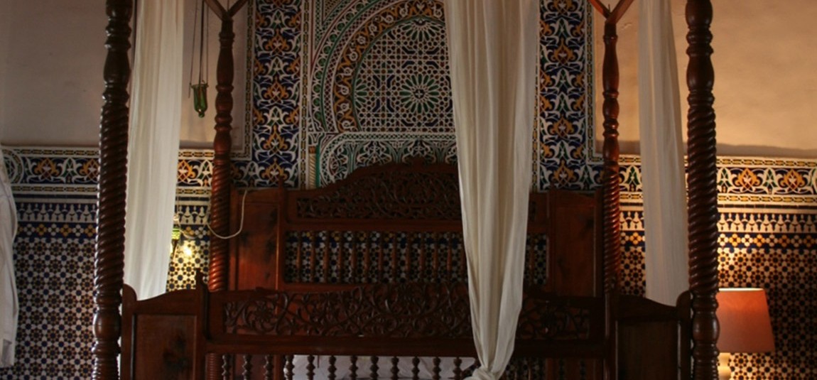 On entre par une antichambre avec placard pour les affaires et de là, on va vers la chambre avec un lit à baldaquin traditionnel marocain, et un bureau ancien. On va aussi vers les toilettes, enfin on va vers un petit escalier qui monte vers la sdb où il y a uniquement une baignoire avec douche intégrée, + vasque.